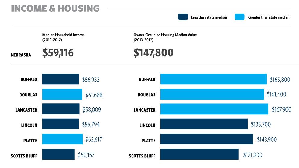 Similar to families in Colorado and Ohio, families in Nebraska increasingly utilize dual-income households to afford a middle-class lifestyle. What makes Nebraska unique is the extent to which families work longer hours and hold multiple jobs at once to secure a middle income, when simply working normal hours in a single job is not enough. The state has the fourth-highest labor force participation rate and the third-highest employment to population ratio in the country.3 In 2015, 7.7 percent of workers in Nebraska held multiple jobs, compared to 4.9 percent for the nation.4 A more recent regional survey found that 15 percent of the adult population in Omaha, 16 percent in Lincoln, and 18 percent in northeastern Nebraska (including Columbus) hold multiple jobs.5